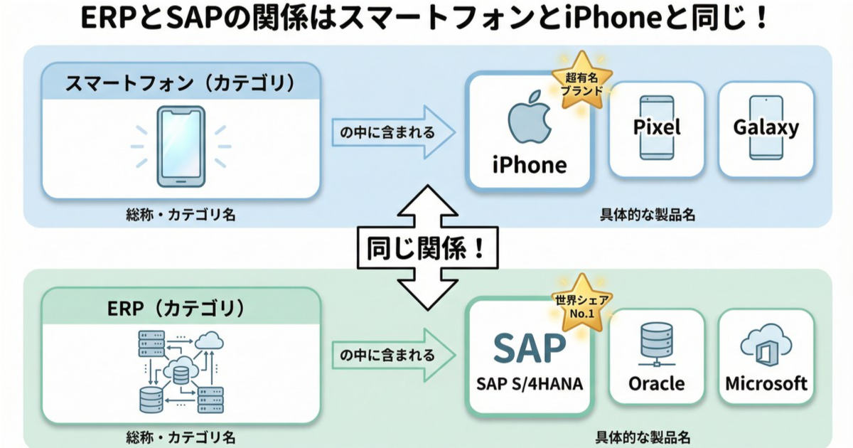 この関係と全く同じで、「ERP」がスマートフォンというカテゴリだとすれば、「SAP」はiPhoneという超有名ブランドの製品にあたるのです。