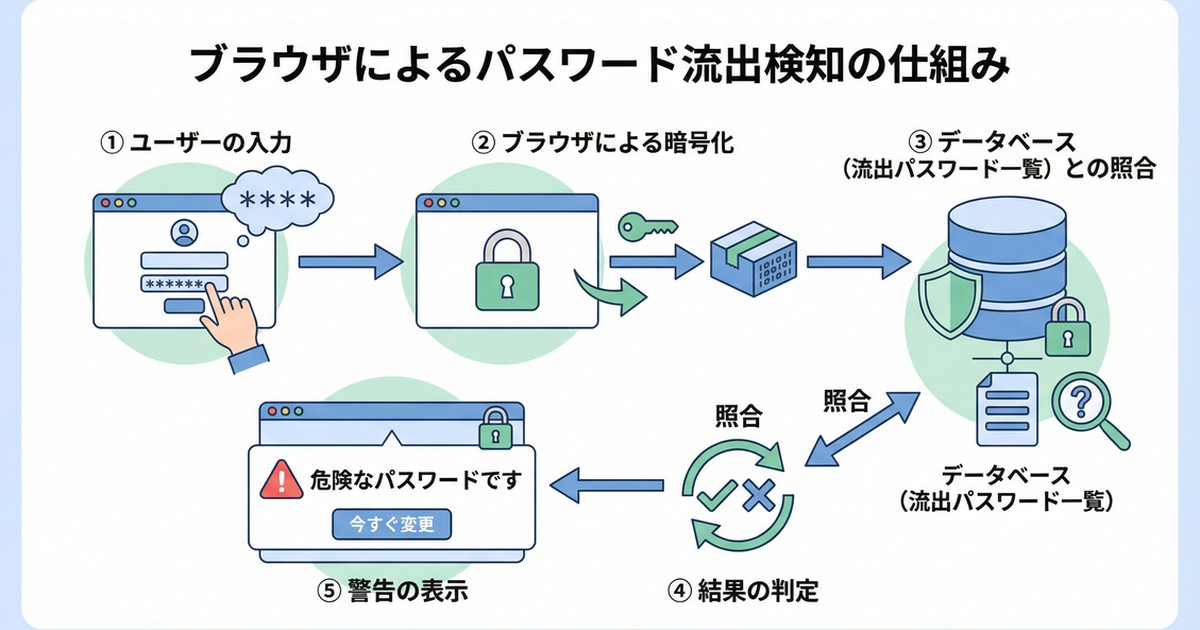 ブラウザは、あなたが家の鍵(パスワード)を使おうとしたときに、「お客さん、その鍵は過去に出回ったことがある危ない鍵ですよ」とこっそり教えてくれているようなイメージです。